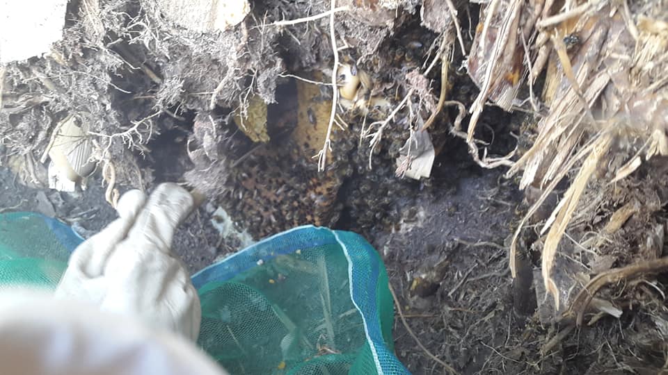La cavidad que proporcionan las raices de los carrizos en muy irregular, en comparacion con el espacio que ofrece una caja de madera especial para las abejas meliferas, es por esto que los panales que encontramos aqui, tenian formas muy arrugadas por asi decirlo, se doblaban teniendo curvas muy precipitadas y en partes se anchaban o extendian, era complicado amarrarlos en los bastidores. Se recomienda recrear el panal o la estructura que tenia en la caja todo lo posible, en este caso no lo logramos.