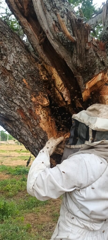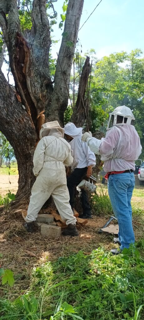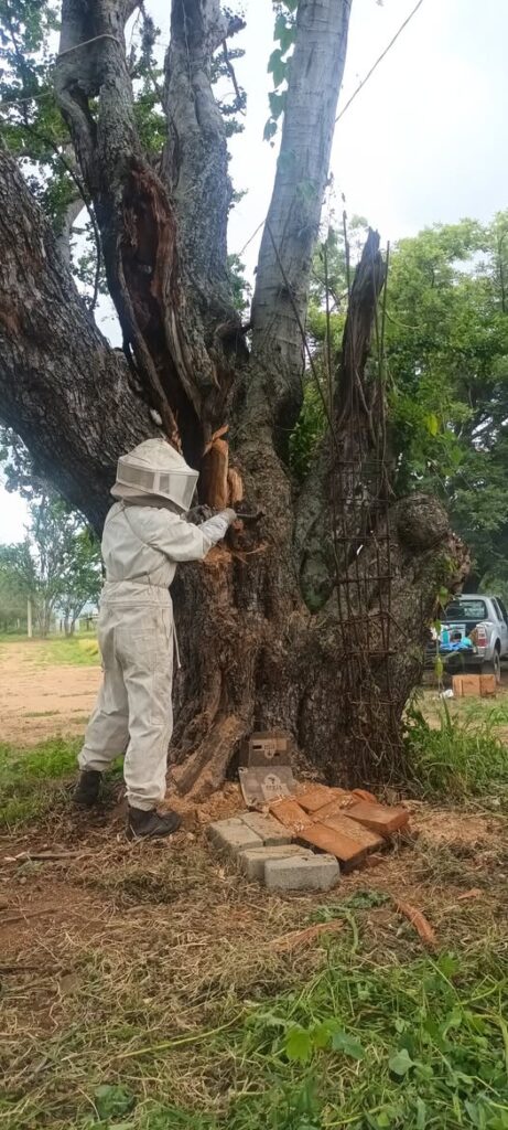¡Misión cumplida! La colonia completa, con sus panales y su reina, ya se encuentra dentro de la caja de colmena. Se cubre con una malla para su transporte seguro al apiario donde tendrá su hogar definitivo.Una mirada cercana al interior de la cavidad del árbol, donde se puede apreciar la gran cantidad de abejas protegiendo su panal antes de la reubicación.La parte más artesanal: los panales con cría y miel son cuidadosamente cortados y amarrados con hilo en los nuevos bastidores de madera. Así, la colonia puede adaptarse rápidamente a su nueva caja.El equipo evalúa la estructura del árbol y planifica los siguientes pasos para extraer los panales sin dañarlos y asegurando la mayoría de las abejas.Trabajo en equipo. Varios especialistas colaboran en el rescate, utilizando el ahumador (herramienta clave) para calmar a las abejas durante el proceso.Un especialista en apicultura, portando el traje de protección completo, inicia el delicado trabajo de abrir el hueco en el árbol para acceder a la colonia.
