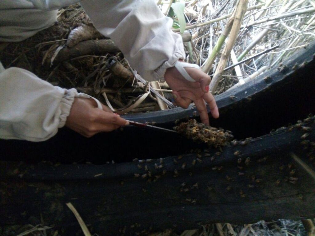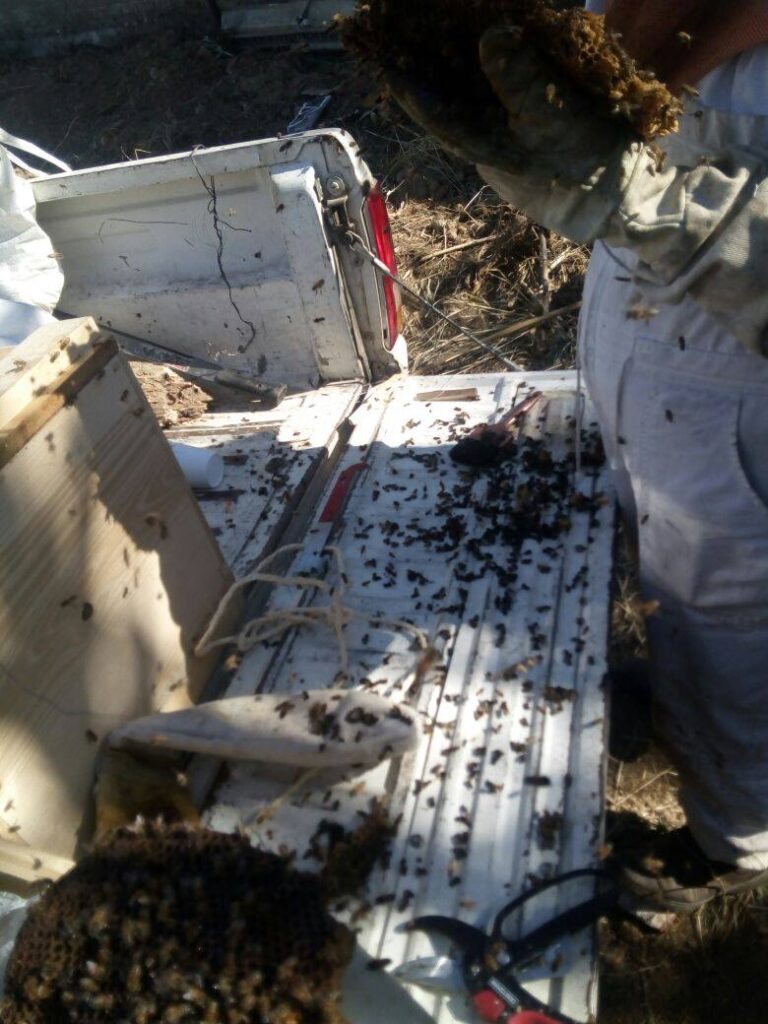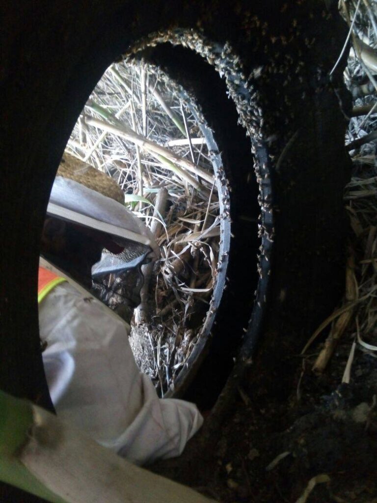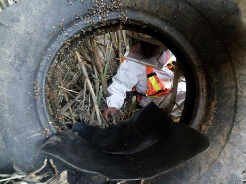 En los terrenos abandonados donde en lo general los llenan de basura la humanidad suele depositar sus desechos, en este caso estaba lleno de llantas de diversos tamaños, a decir verdad en la gran extensión de este terreno en la entrada se encontraba una vulcanizadora y taller de maquinaria pesada, el estacionamiento para carros grandes ocupaba tan solo la mitad del área, al fondo estaba lleno de hierbas en su mayoria carrizo y otras especies de arbustos. Es en esta parte de la superficie cerrada donde se encontraban varias llantas de diferentes tamaños tiradas, los propietarios no se habian dado cuenta de la existencia de las colmenas de abejas, fue hasta cuando metieron maquinaria pesada para limpiar y rellenar, el operador de la retroexcabadora al momento de mover las llantas grandes como la de tractor y trocero fue “atacado” por un montón de abejas, lo que hizo que corriera saliendo del lugar precipitadamente, dejo la maquinaria prendida pero no le importó, el dolor era tan fuerte que acudio a un centro de salud.